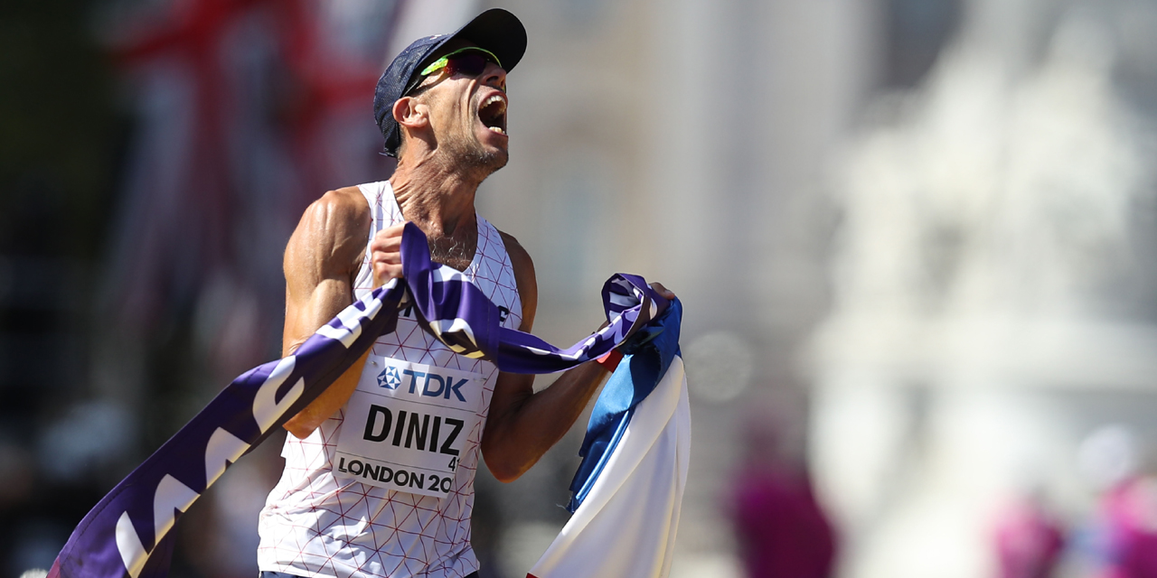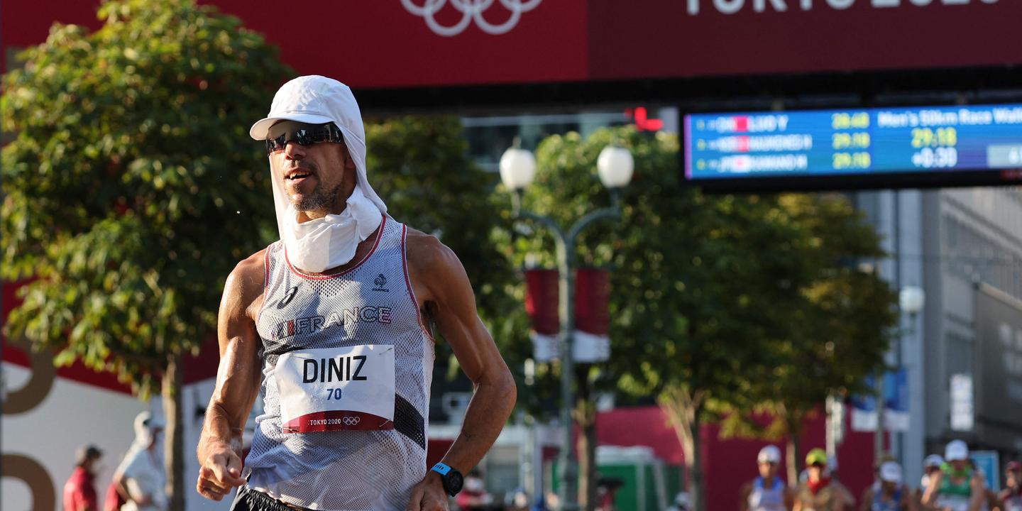 Yohann Diniz lors de sa victoire au 50 km marche lors du championnat du monde en 2017. En 50km marche Yohann Diniz qui à 43 ans disputait la dernière course de sa carrière a abandonné peu après la mi-course le 50 km marche des Jeux olympiques de Tokyo à. Mais celle-ci sest achevée sur un couac puisque le.
